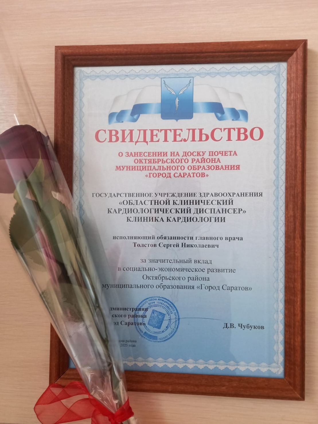 • Областной кардиодиспансер занесен на Доску почета Октябрьского района г. Саратова