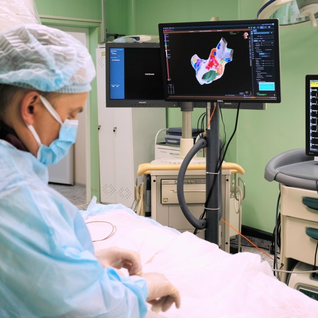 «ЭФИ сердца – это малоинвазивная процедура, которая проводится в операционной, оснащенной рентгено-ангиографической системой и специализированной ЭФИ-станцией, - рассказал заведующий КХО №3, аритмолог, к.м.н. Денис Сергеевич Терехов. – Катетеры вводятся под местной анестезией в вены через небольшие проколы. Обычно это подключичная вена, также бывают задействованы вены бедра. В некоторых случаях применяется артериальный доступ, при этом осуществляется пункция бедренной артерии. При помощи специальной программы, используя электрические импульсы, врач провоцирует сердцебиение, прекращает его, обрабатывает полученные результаты на ЭФИ-станции и таким образом определяет локализацию аритмогенных зон или уровень поражения проводящей системы сердца при нарушениях проводимости сердечного импульса».