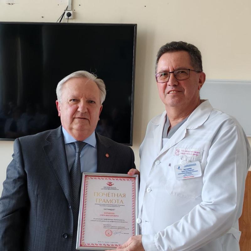 Свой "пост" ей передал заведующий приемным отделением Олег Викторович Журавлев, возглавлявший первичку с момента открытия ГУЗ "ОККД" в 2008 году. С.А.Прохоров поблагодарил его за большой личный вклад в развитие профсоюзного движения и вручил Почетную грамоту.